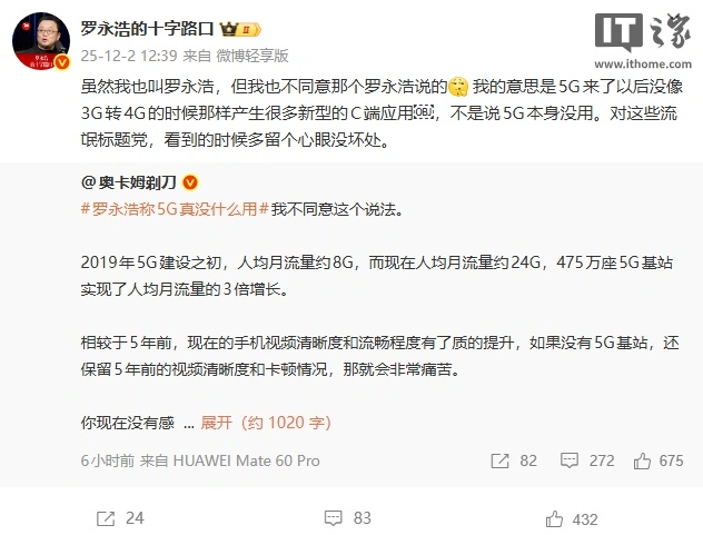 IT之家 12 月 2 日消息,罗永浩在自己的节目中与“何同学”互动,谈到了 5G,后续有媒体将其言论解读为“罗永浩称 5G 真没什么用”并引起了不少争论。